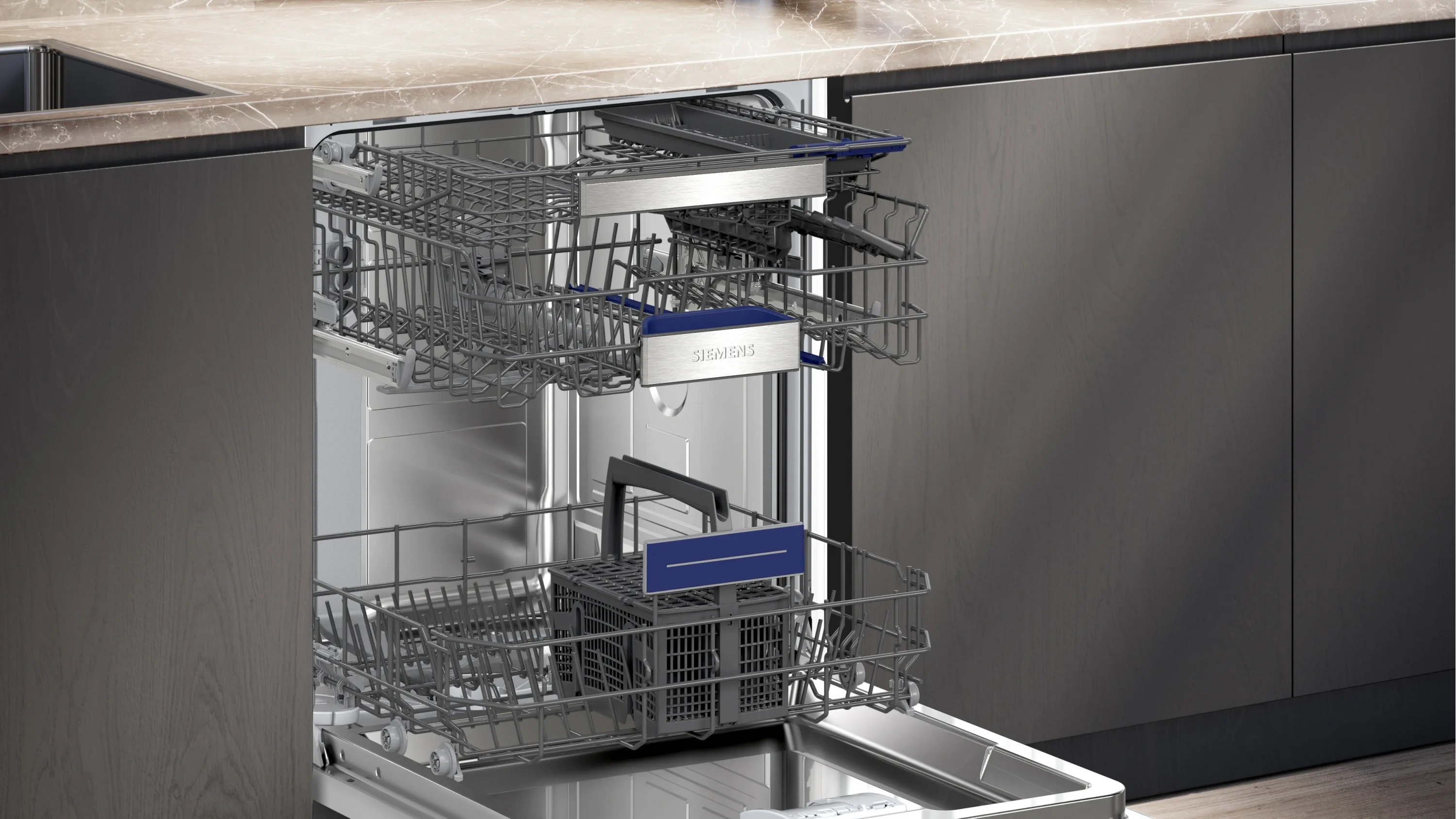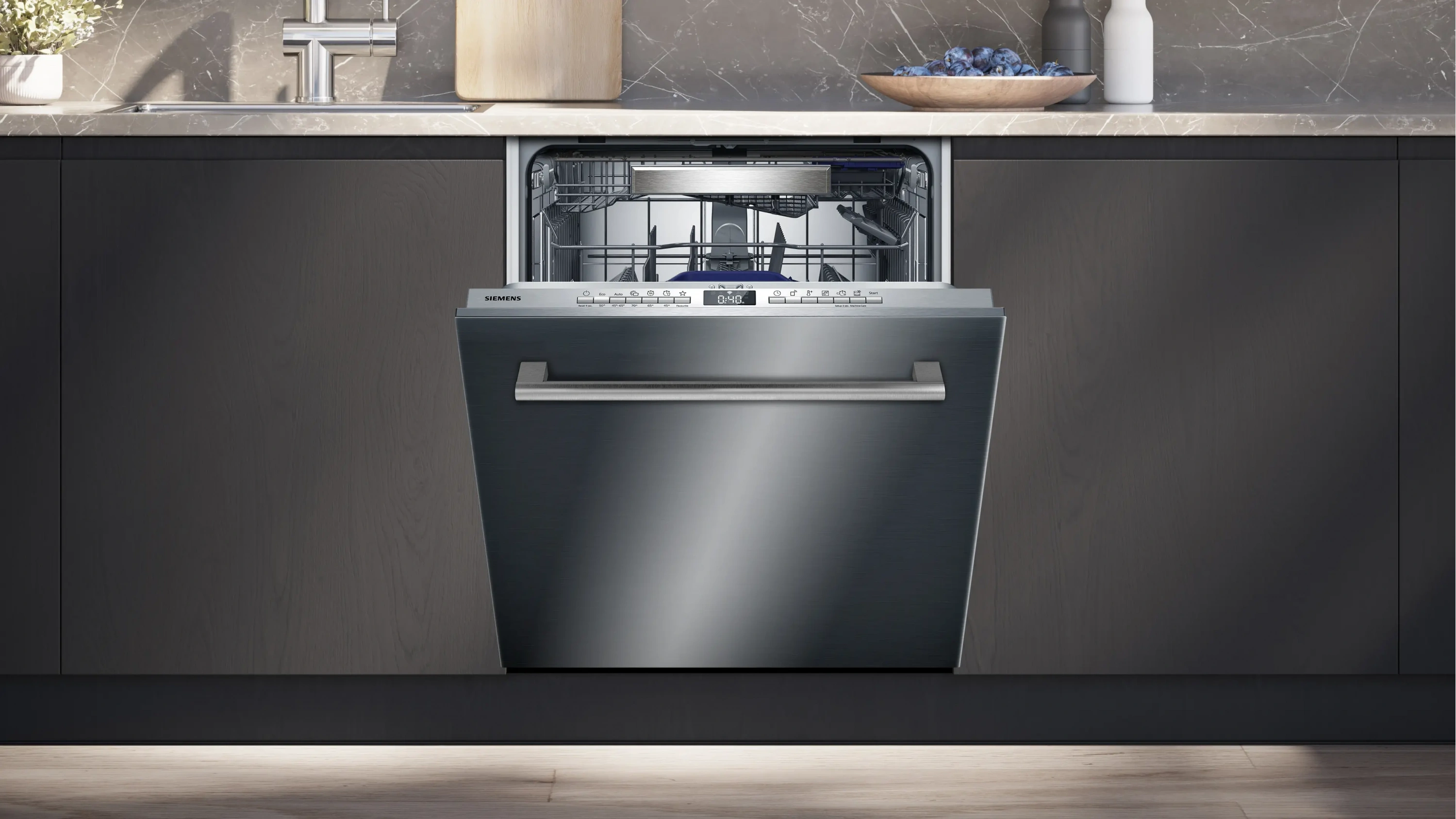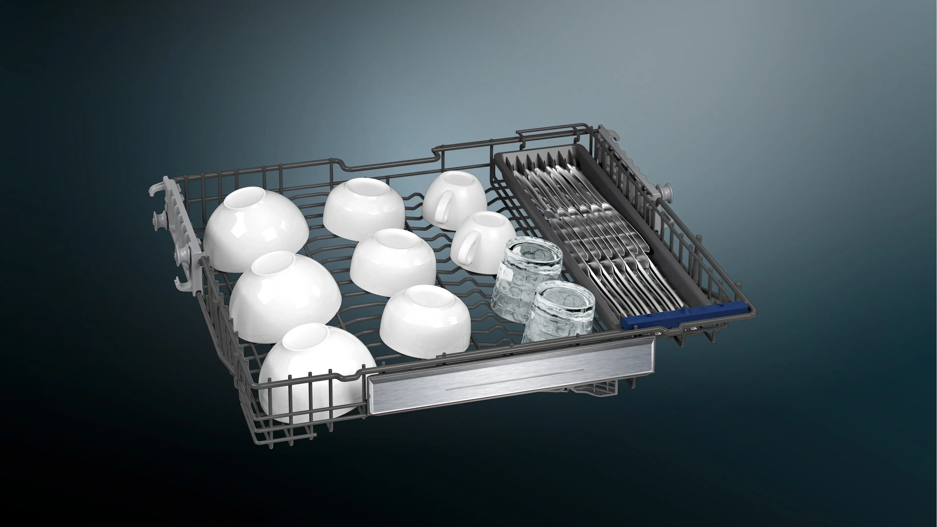 Ayarlanabilir üst sepet, 3. sepet (çatal-bıçak çekmecesi) ve katlanabilir raf sistemleri sayesinde iç hacim verimli şekilde kullanılabilir. Modern siyah tasarımı ve kullanıcı dostu elektronik kontrol paneli ile mutfaklara şık ve pratik bir çözüm sunar.