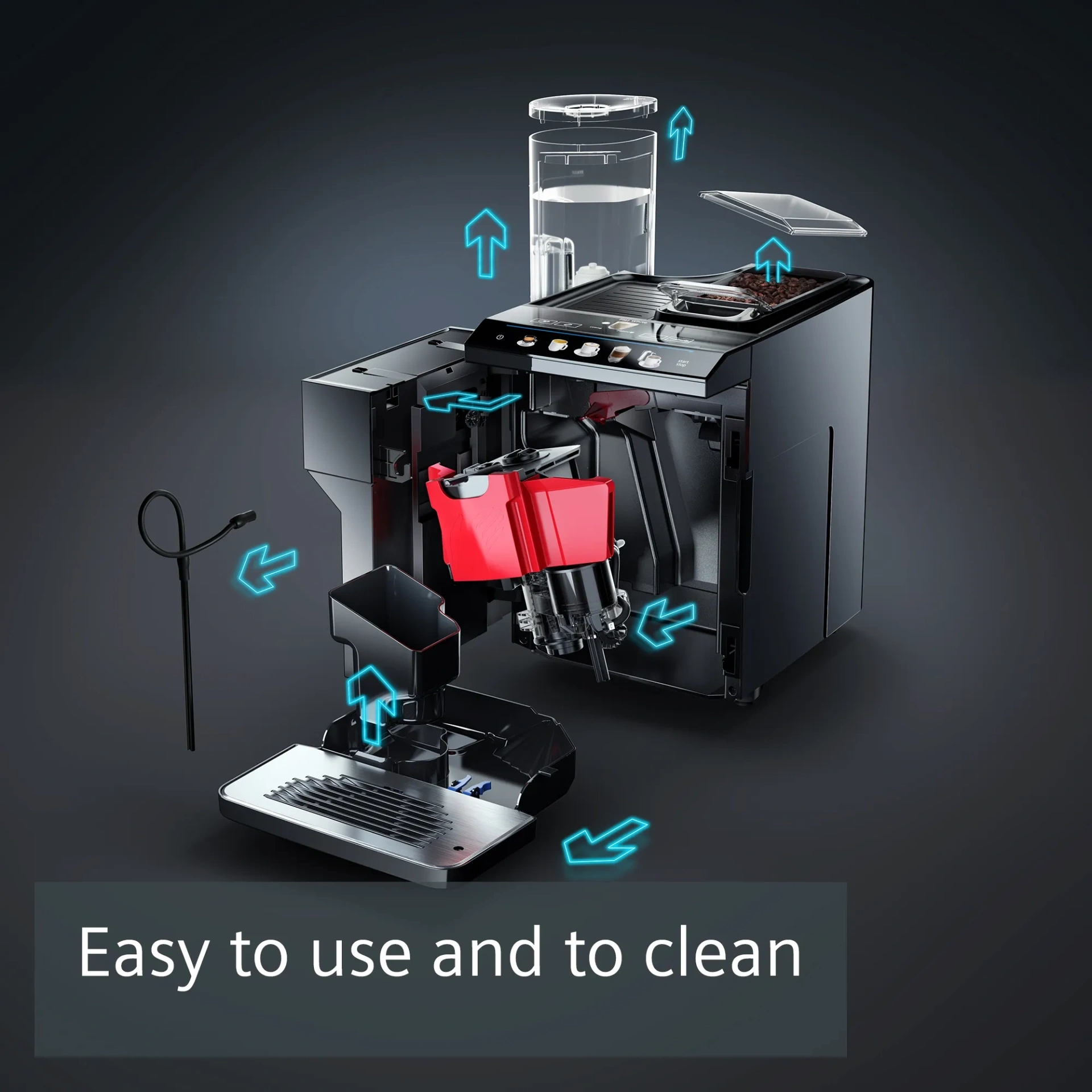 Önden açılan kapak sayesinde kolay erişilen demleme ünitesi sayesinde kolay bakım ve kullanım.
